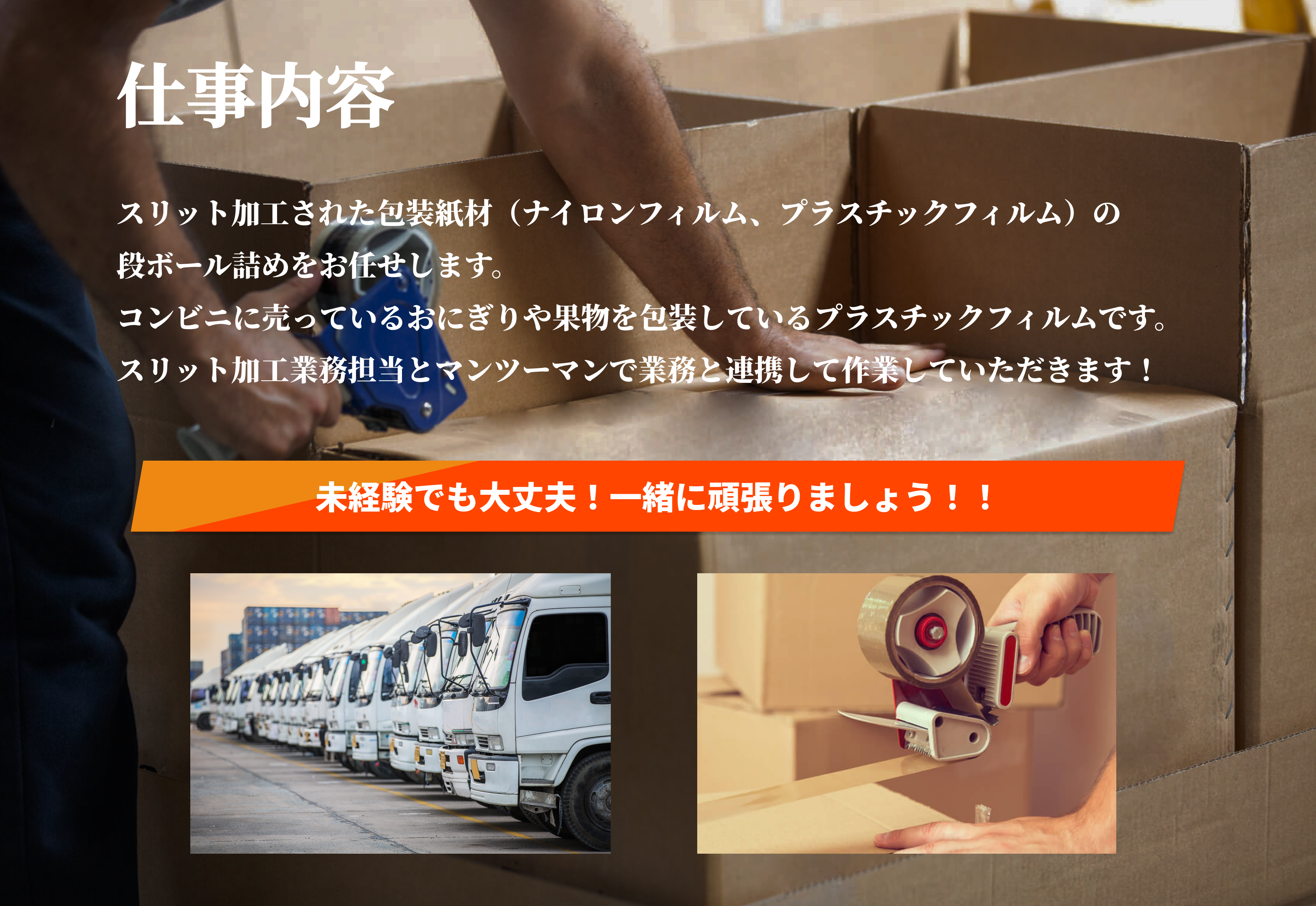 スリット加工された包装紙材(ナイロンフィルム、プラスチックフィルム)の段ボール詰めをお任せします。この業務に経験や資格は必要ありません!簡単な作業なので誰でも簡単にはじめられます!